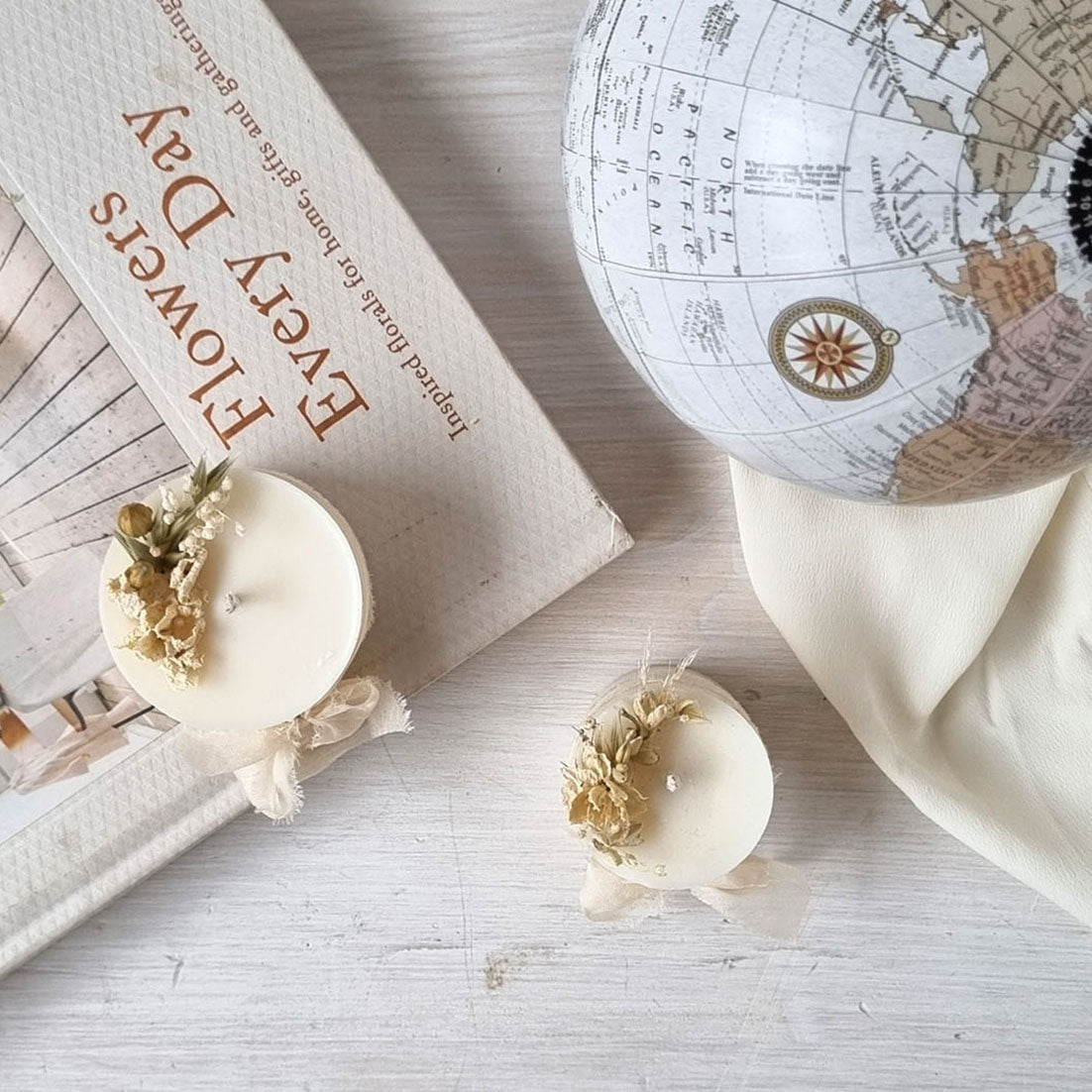 Candela artigianale in cera di soia naturale, decorata a mano con delicati fiori essiccati.